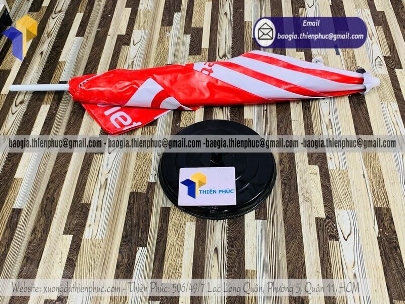 + Đóng gói: Bọc nylon từng cây dù, mỗi cây đều được phủ bột cát lên mặt dù chống dính lem màu in.