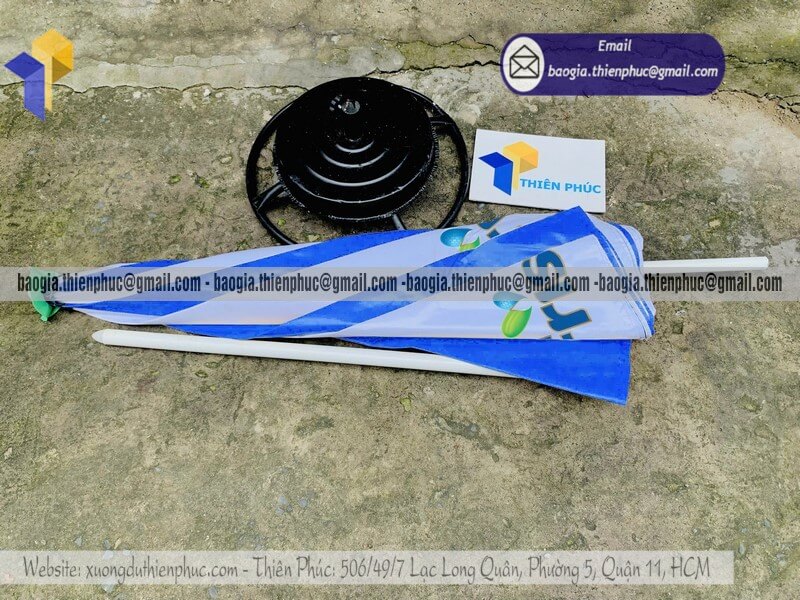 + Đóng gói: Bọc nylon từng cây dù, mỗi cây đều được phủ bột cát lên mặt dù chống dính lem màu in.