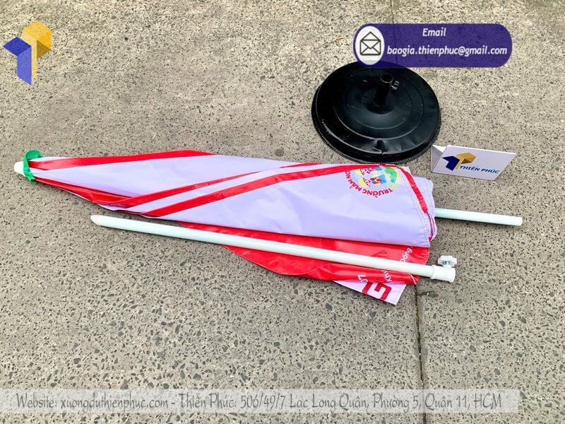 + Đóng gói: Bọc nylon từng cây dù, mỗi cây đều được phủ bột cát lên mặt dù chống dính lem màu in.