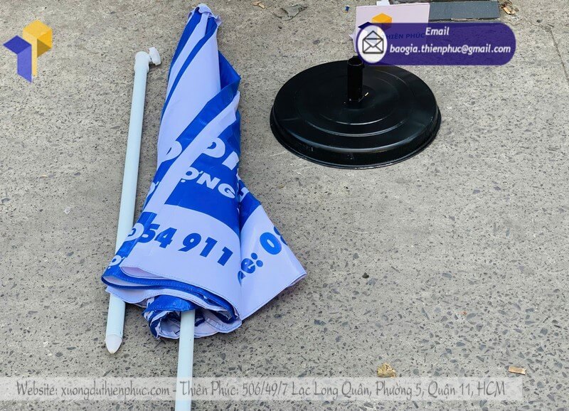 + Đóng gói: Bọc nylon từng cây dù, mỗi cây đều được phủ bột cát lên mặt dù chống dính lem màu in.
